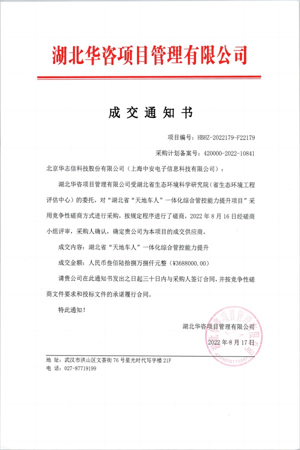 中安科技中標湖北生態(tài)環(huán)科學院“湖北省‘天地車人’一體化綜合管控提升”項目(2022/10/10)